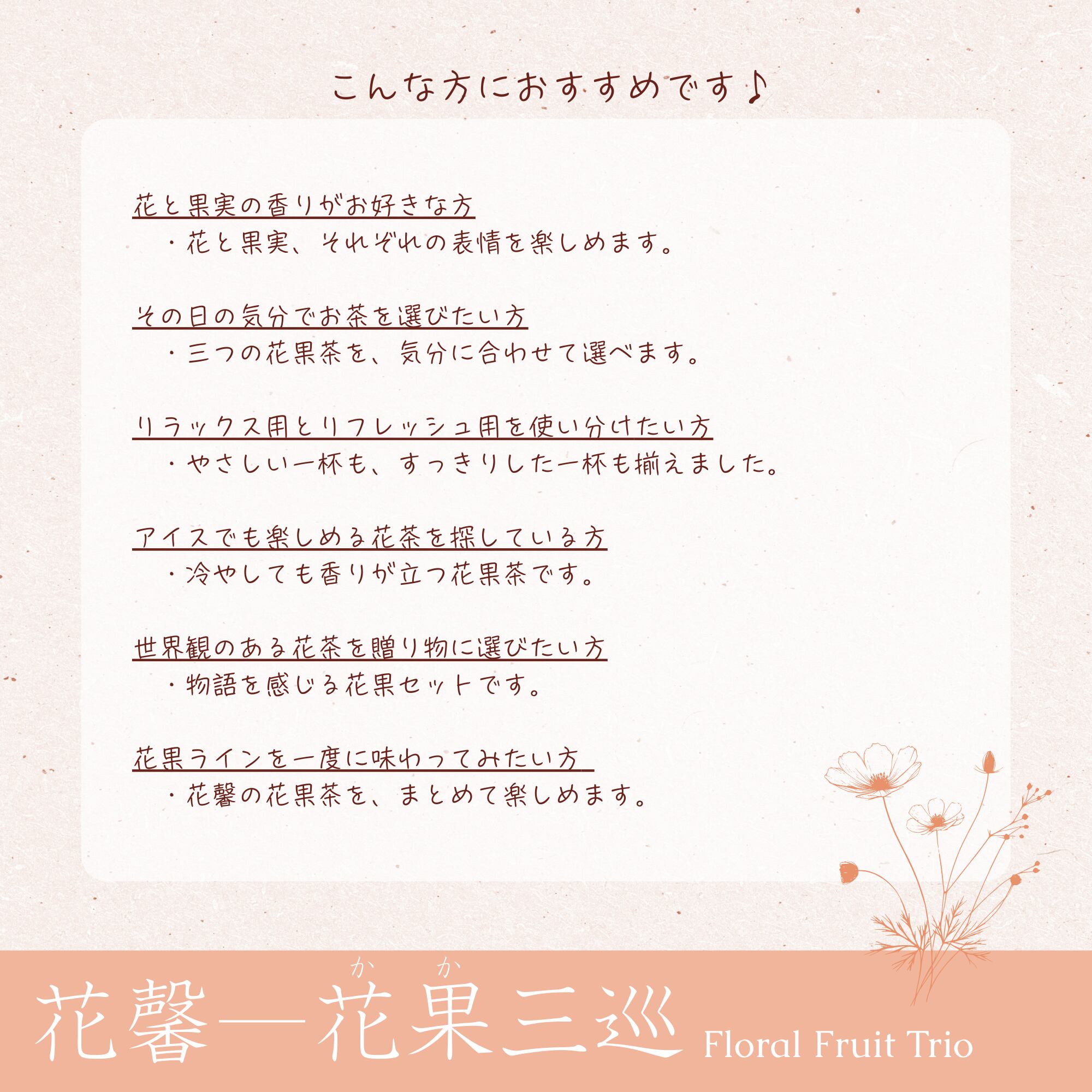 花と果実をテーマに仕立てた三種の花果茶をめぐるセットです。